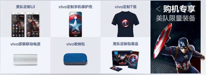 据了解,此次vivo与漫威合作,在《美国队长3》上映同期推出美国队长Xplay5旗舰版,除了各类定制化礼品、包装之外,在系统上也有深度定制。美国队长Xplay5旗舰版将搭载《美国队长3》独家定制版UI,并将有大量周边礼品赠送,包括vivo原装P50移动电源、vivo收纳包、美队定制手机壳、美队定制T恤、半年碎屏保和半年延保等超值礼品,并将可以进行免息12期分期或24期费率五折优惠,晒单更有其他好礼相送,非常超值。