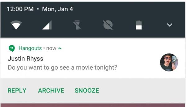 如此便利的功能根本不知道为什么之前不存在!更新了Android N之后,你就可以在消息弹出屏幕的瞬间,直接回复。当然,你也可以选择稍后回复或忽略消息。此法对日历事件也是有效的。直接在通知上回复,而不需要切换到消息应用程序,将节省很多时间和精力。