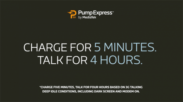 联发科介绍称,通过Pump Express 3.0,使用者只要充电五分钟,手机就能够通话长达四小时。此速度几乎是目前市场上竞争方案的两倍,并且比传统的充电技术快了五倍之多。