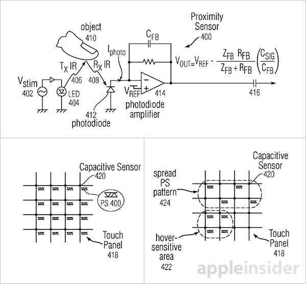 就实现方式而言,专利中,苹果建议使用红外LED和光电二极管,由LED产生的光照射在用户手指上,返回后被光电二极管所捕获。通过部署多个传感器,该系统可检测悬浮在屏幕上空的手指、手掌和其他物体。