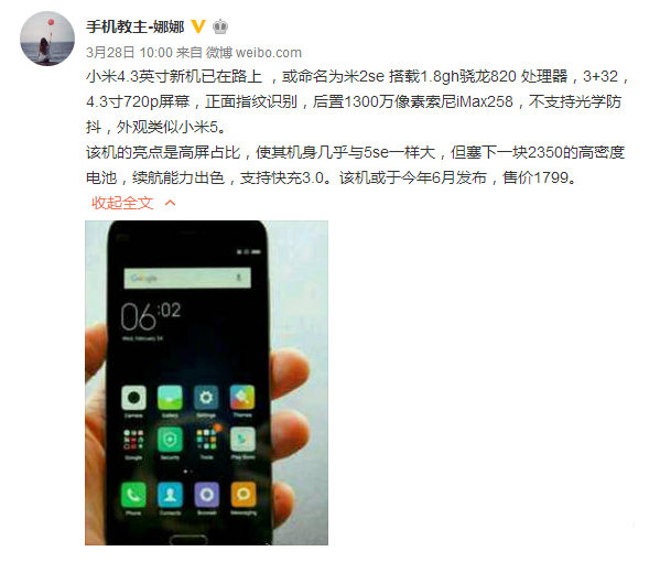 据悉,小米正准备推出一款名字为小米2 SE的4.3英寸的旗舰手机,屏幕分辨率为720P,外观类似小米5,配备了1.8GHz 骁龙820处理器,3GB RAM+32GB ROM,机身正面搭载指纹识别模块,后置摄像头为1300万像素索尼IMX258,不支持光学防抖功能,电池容量为2350mAh,支持QC3.0快充,主打高平占比,售价估计为1800元,具体的发布时间估计在6月份。