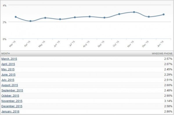 市场调查机构Net Applications在2月1日公布了一组数据,WP系统在去年12月出现了明显的下滑,从11月份的3.14%占比下滑至2.58%,不过在今年1月份的占比达到了2.86%,增幅为0.28%。