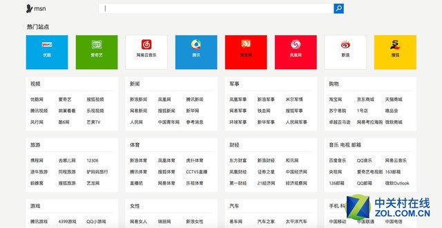 现在打开MSN中文网的网址以及被替换成了一个网址导航网站,顶部是微软自家的必应搜索,下方则是各个新闻来源的网址导航。