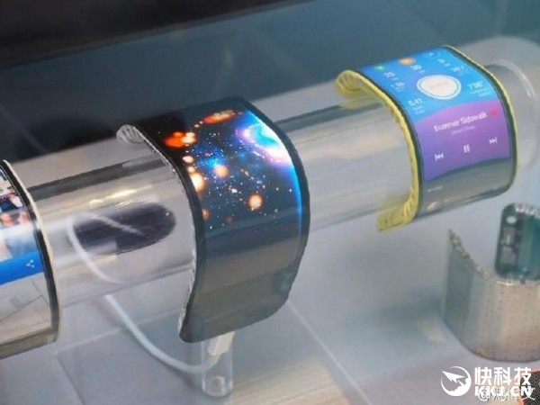 从现场展示来看,有一款类似于腕带的可弯曲设备,用户可将其作为带屏幕的手环戴在手环上。此外,还有可弯曲平板、手机等。