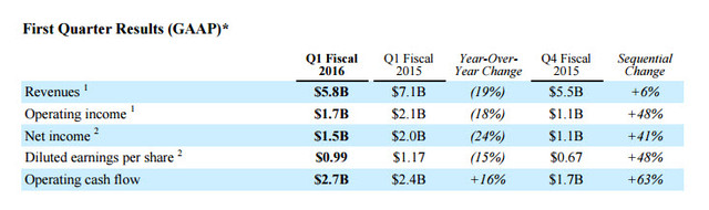2016年第一财季,高通公司的营收为58亿美元,比上一财季的55亿美元增长6%,比上年同期的71亿美元下滑19%。其中运营利润为17亿美元,比上一财季的11亿美元增长48%,比上年同期的21亿美元下滑18%;净利润为15亿美元,比上一财季的11亿美元增长41%,比上年同期的20亿美元下滑24%;经营现金流为27亿美元,比上一财季的17亿美元增长63%,比上年同期的14亿美元增长16%。