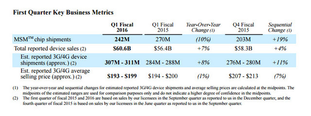 高通第一财季MSM芯片出货量为2.42亿,同比下滑10%。高通预计2016财年第二财季营收为49亿美元到57亿美元,同比下滑17%到29%,其中值为53亿美元,低于分析师此前预期。