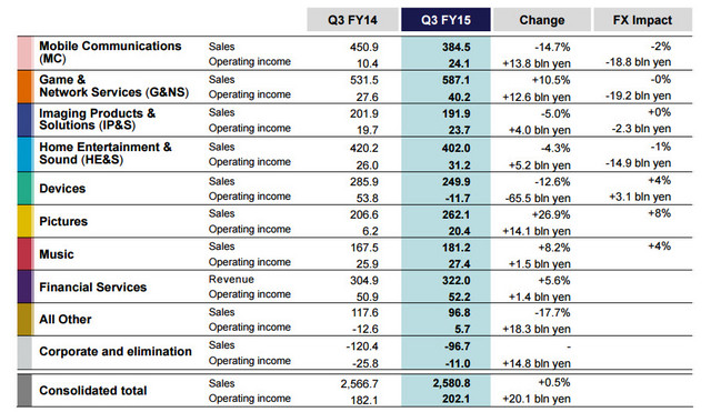 索尼公司公布了2015财年第三财季业绩。财报显示,截止到2015年12月31日,索尼公司销售收入为25,808亿日元(约合215.07亿美元),同比去年增长0.5%。营业利润达到2,021亿日元(约合16.85亿美元),同比增长11%。
