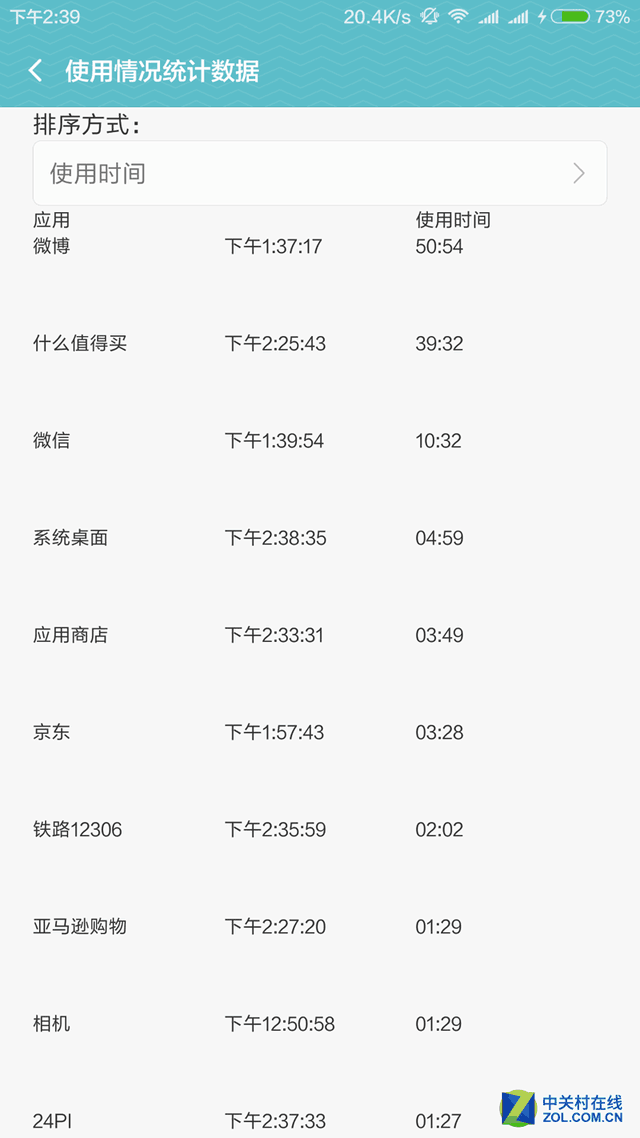 所用应用按照使用时间依次排列。不难看出,笔者是个喜欢社交和网络购物的人,数据和平时的使用习惯完全契合。笔者平时没有规律的玩游戏的习惯,也不怎么阅读电子书或用手机看视频,所以数据比较单调,各位朋友不妨测试下自己的使用习惯进行比较。
