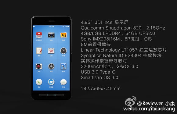 位置方面有4.95寸JDI Incell显示屏(1080p?)、骁龙820 2.15GHz处理器、4/6GB LPDDR4内存、64GB UFS 2.0存储、索尼IMX298 1600万像素后置摄像头、800万像素前置摄像头、Linear LT1057独立运放芯片、3200mAh电池和QC 3.0快充恒、USB 3.0 Type-C接口、Smartisan OS 3.0操作系统。