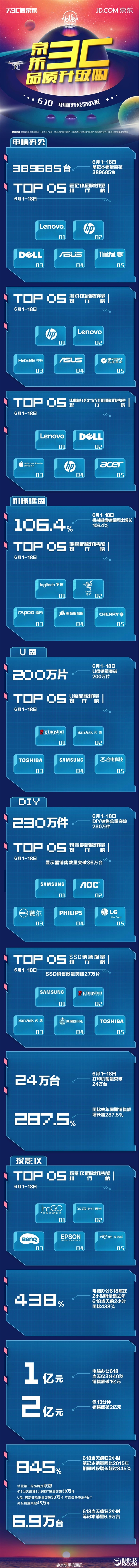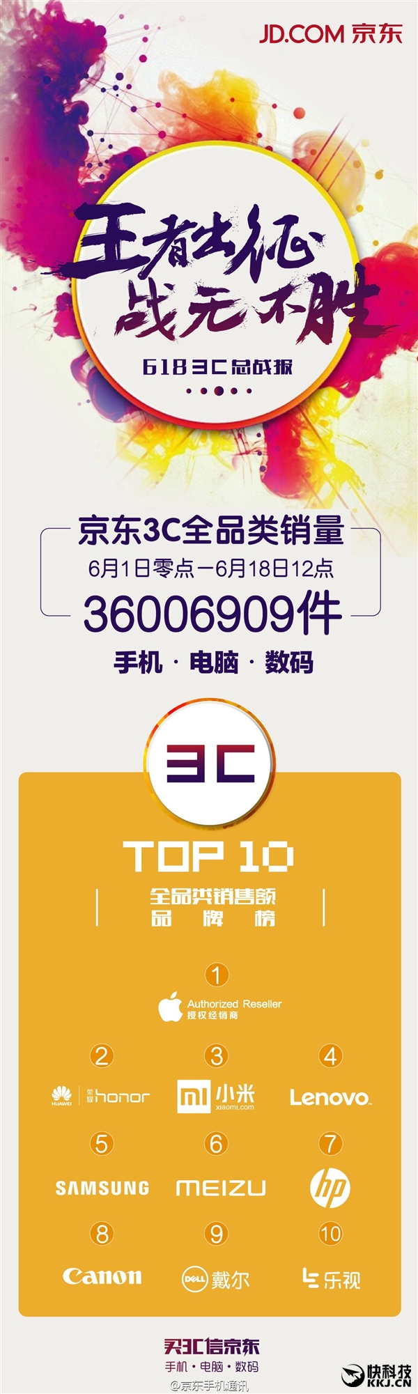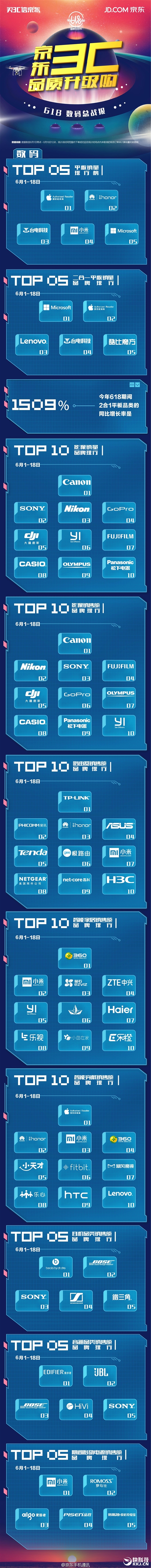 截止至18日12点,京东3C全品类销量达到36,006,909件,销售额总排行TOP10分别是:苹果、华为(包括荣耀)、小米、联想、三星、魅族、惠普、佳能、戴尔、乐视。