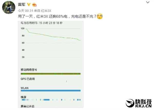 今天,雷军在官微晒出了红米3X的续航成绩——