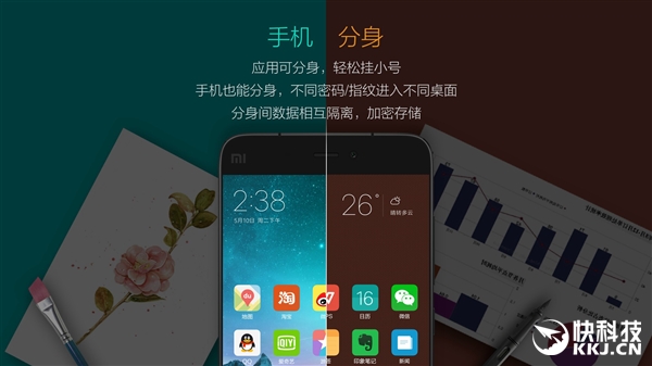 MIUI 8的分身功能是由加拿大移动技术公司Graphite Software提供的“Secure Spaces”虚拟手机解决方案实现,用户可以通过不同的解锁密码进入两个完全独立的系统空间,实现如同拥有第二部手机一般的虚拟手机体验。