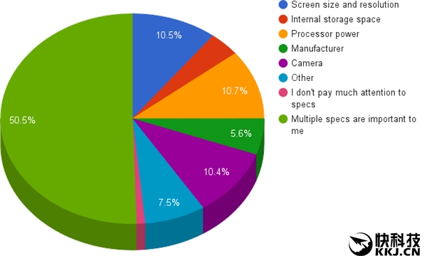 如果要具体挑一个的话,处理器(10.7%)依然排第一、屏幕尺寸和分辨率(10.5%)第二、相机(10.4%)第三,之后其他、品牌、内存。