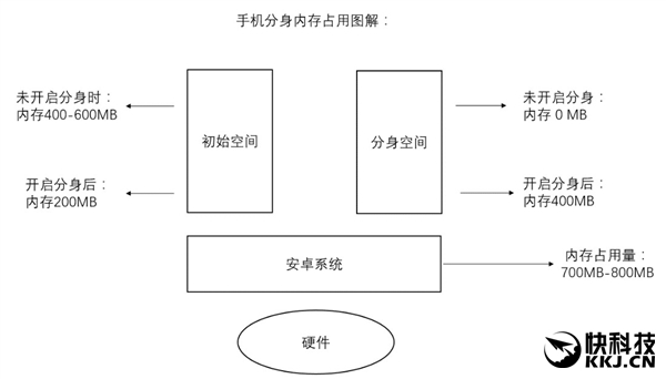 其实手机分身就好比一个虚拟桌面,有一部分共用的安卓内存,大约为700-800MB。在未开启初分身时,初始空间占用的运行内存大约为400-600MB,在开启了手机分身后,运行内存变化就好比一个跷跷板,初始空间所占内存下降至200MB,分身空间占用内存到400MB。
