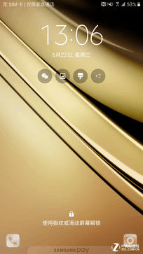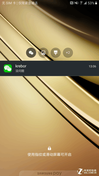 在锁屏界面上,三星Galaxy C5除了左右两个通话、相机快捷键以外,对于通知也有一定的优化,一般情况下,手机的锁屏界面显示应用推送内容,可一旦消息过多就会出现满屏消息的状况,在Galaxy C5通知则会以4个小圆圈图标显示,依次点击相应图标就会出现内容,想要查看多个通知只需要点击最后一个图标即可,简洁且不失高效性。