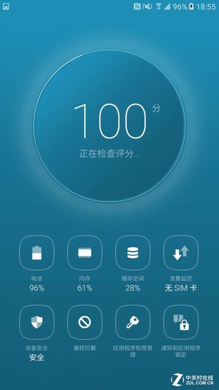 从界面上看,智能管理器主要分为八大部分,分别为电池、内存、储存空间、流量监控、设备安全、骚扰阻止、应用程序权限管理和通知应用程序锁定,在此可以直观的了解到手机状态,及时释放手机内存。
