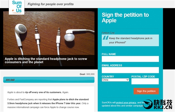 从今年1月份开始,就不断有果粉在知名公益网站SumOfUs.org发起请愿书投票(请愿地址,你也可以投一票),要求苹果保留3.5mm耳机接口。目前,请愿人数已经超过30万人,达成当初的目标