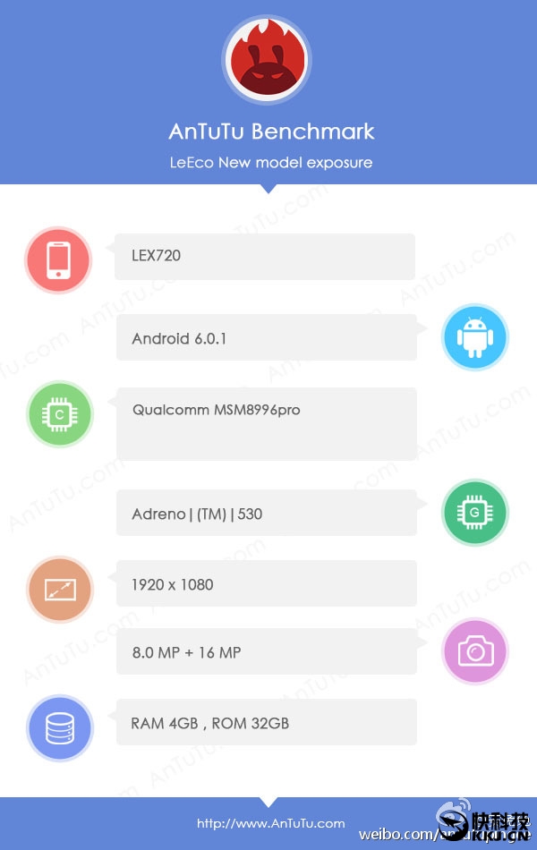 据了解,乐视这款新机的代号为LEX720,将搭载高通8996pro(名字为骁龙821或骁龙823)处理器,GPU还是Adreno 530,采用4GB、32GB存储组合(并没有之前传闻的8GB),屏幕分辨率为1080P,摄像头为1600万、800万像素组合,运行安卓6.0.1系统。