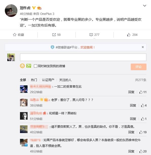 继前段时间的“手感湿滑”之后,今天刘作虎又在微博上称赞自家的一加3,表示“专业黑越多,说明产品越受欢迎。