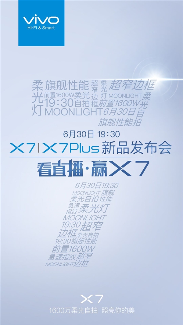 正面指纹识别、金属机身、超窄边框、4G+64G、前置1600万柔光自拍镜头……今晚19:30,vivo将在北京中国电影导演中心召开新品发布会,X7/X7 Plus联袂登场