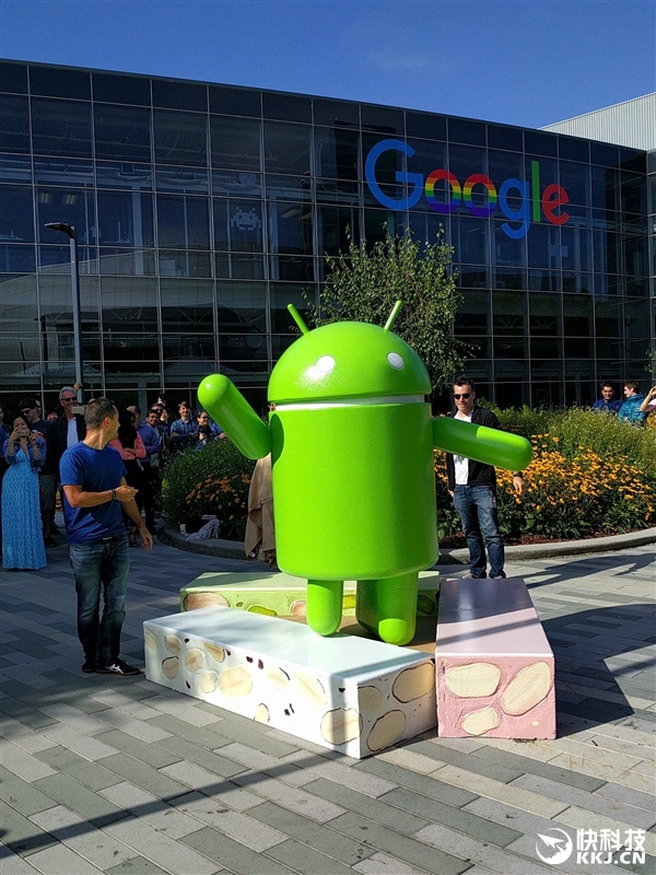 按照传统,Google总部园区里已经树立起了安卓机器人加牛轧糖的形象,但这次实在太懒了,只是个安卓机器人站在三块巨大的牛轧糖上。