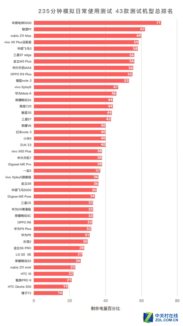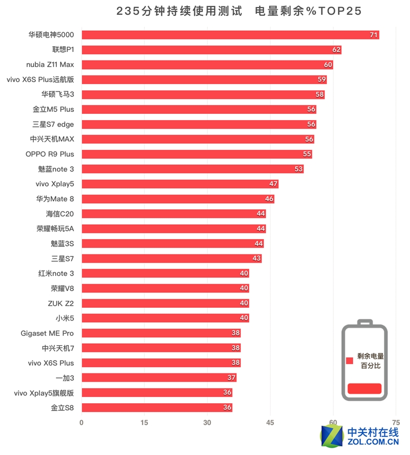 剩余电量百分比TOP25(该测试共43款机型参与,取前25名成绩排序)