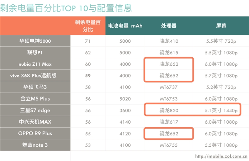 另一方面,自古“性能”与“功耗” 两难全,容易想到“续航持久的产品性能上可能并不突出”这样的结论,于是反过来看配置,以电量百分比剩余TOP10的产品来看,处理器部分Cortex-A53这样的小核心占据绝对的主流,其中还不乏骁龙410、615以及MT6753这样属于去年的处理器平台;而对于各个平台当中的A53核心来说,有些运行频率甚至都低的可怜,再加上部分机型720p的分辨率,省电是自然的事情了。