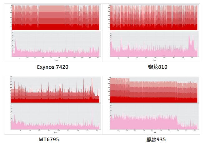 我们曾在之前的处理器横评当中探讨过部分MTK平台的省电问题,比如同为一个4K视频播放过程,Exynos 7420以及骁龙810这样的“旗舰”芯是十分满血的状态,CPU调度和调整十分频繁,特别是骁龙810;而MT6795显得很懒,麒麟935则出现随时间降频的状况。这样造成的实际体验区别就是,前两者在播放流畅度上比后两者更好。