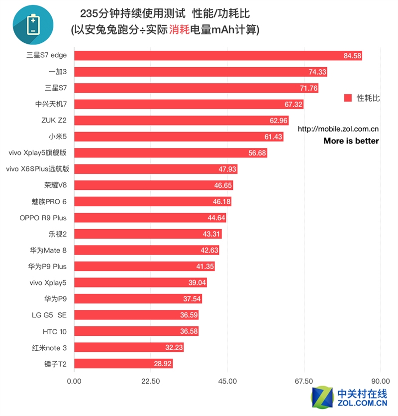 与上一页的结果几乎没有太大出入,以实际电量来计算的续航测试结果当中“消耗最少”或者“剩余最多”的同样是处理器部分为Cortex-A53小核为主的平台或者低配机型,骁龙652与三星S7 edge、S7又一次出现在这一榜单当中足以见其功耗优化的出色水准。