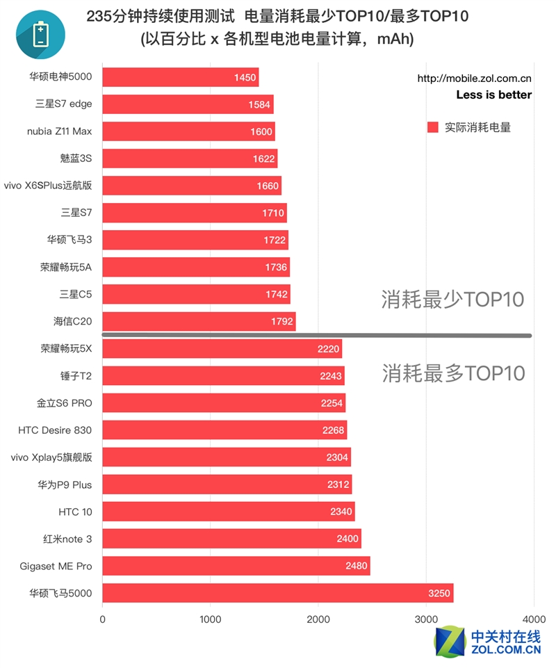 首先来看经历了235分钟持续使用测试过程、10个模拟日常使用环节之后实际电量(mAh)消耗最少和最多的分别10款产品。