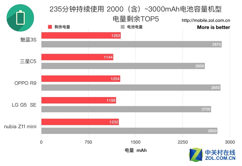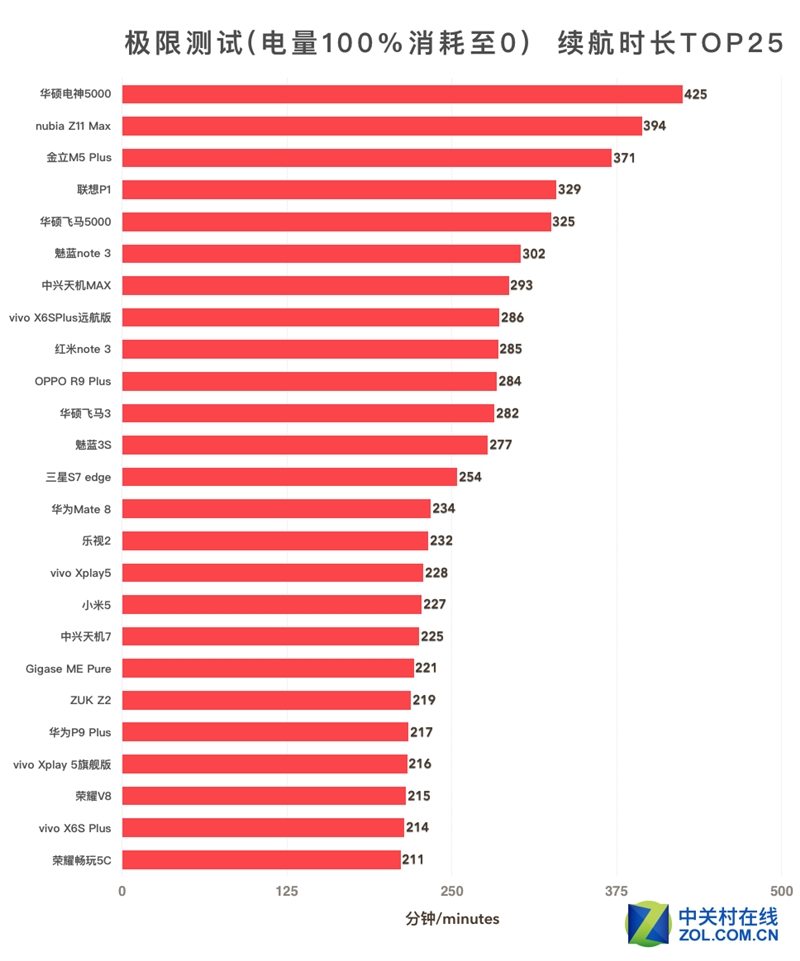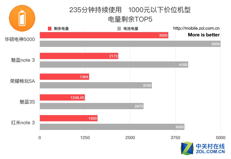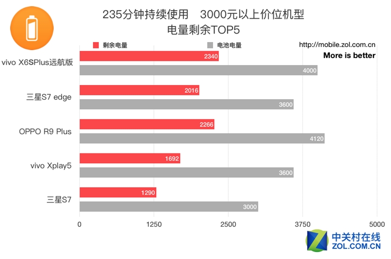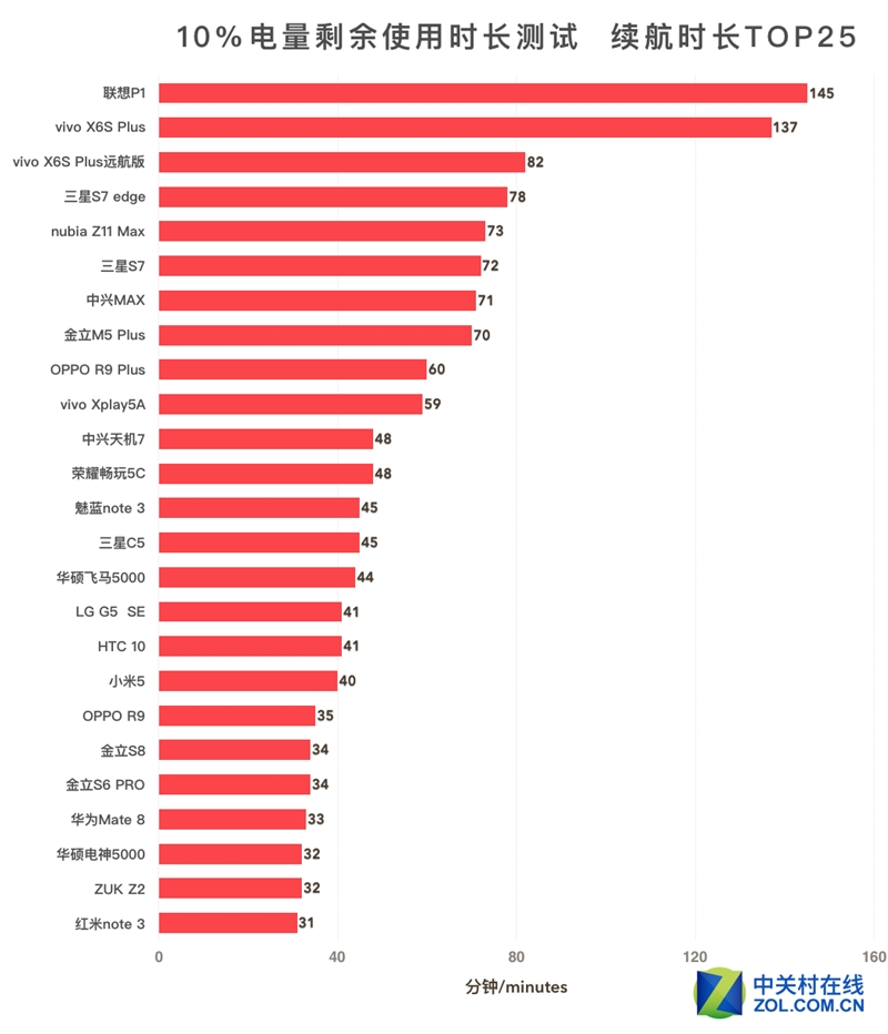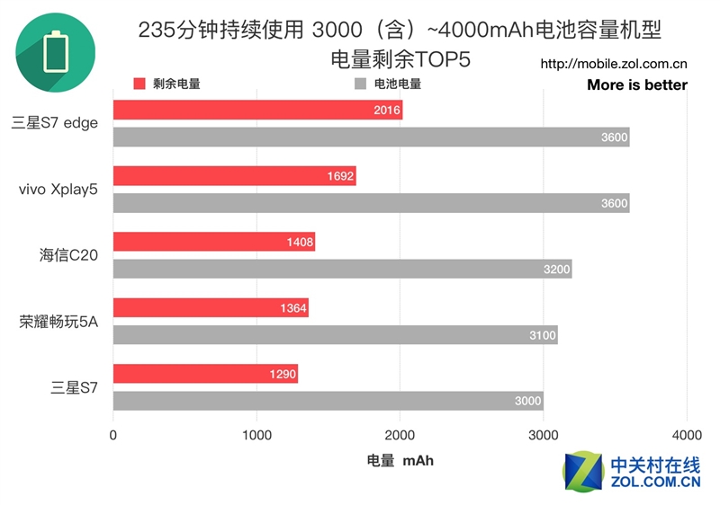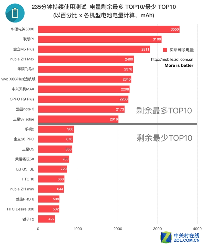 预料之中的,在我们模拟日常生活使用的近四小时持续测试当中,剩余电量的多少还是与手机本身的电池容量有着很大关系,至少前十款机型当中仅有三星S7 edge电池电量低于4000mAh,前25款机型当中也仅有魅蓝3S电池电量低于3000mAh。