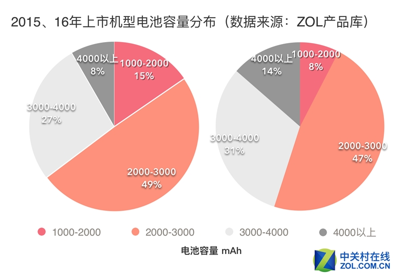从另一个角度——也就是按照各个机型电池电量分组——来比较续航水平,也可以规避因为电池电量相差过大的问题。不妨再来看一下我们开头提到的近两年上市的智能手机电池容量的分布情况,简略从2015年到2016年来看,2000mAh以及2000~3000mAh段的机型分别有7%和2%的份额减少,而3000mAh和4000mAh容量以上的机型却在增加。