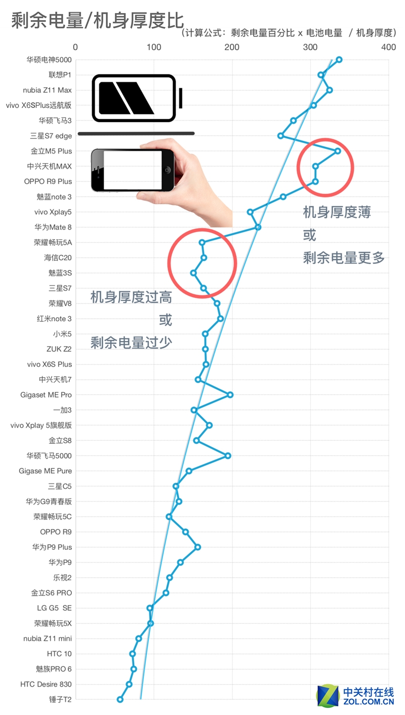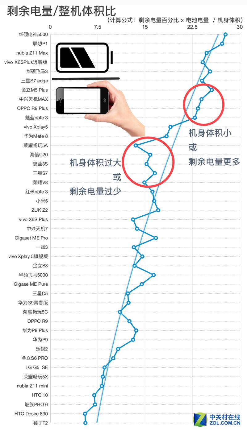 既然提到便携性,不妨这里再涉及一个与实际手感有关的续航指数——“剩余电量/机身厚度比”和“剩余电量——机身体积比”,位于趋势线右侧的意味着能够在维持较薄或体积较小的基础上拥有更好的续航水平,位于趋势线左侧的意味着可能在机身厚度/体积或者续航水平上存在劣势。