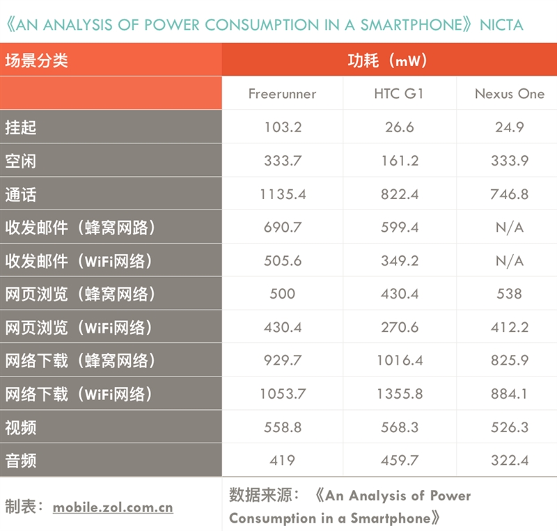 时间回到几年前,来自澳大利亚国家信息通信技术中心NICTA的Aaron Carroll和Gernot Heiser于2010年发布《An Analysis of Power Consumption in a Smartphone》,深入的从元器件和用户使用场景两个角度探讨了智能手机当中的真实耗电情况;当时使用的诸如HTC G1和Nexus One这样的测试手机已经离我们非常久远。