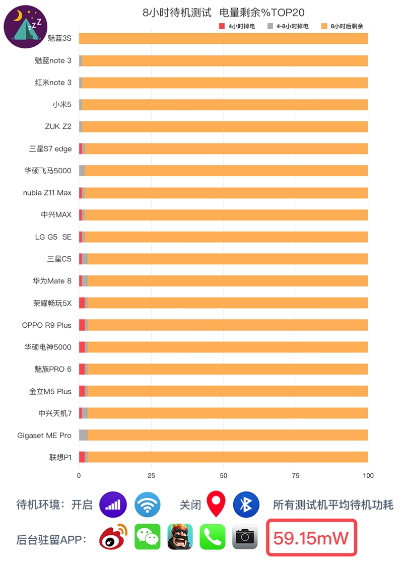 测试手机在100%电量的条件下插入SIM卡并接入4G LTE网络,开启Wi-Fi网络,关闭蓝牙、GPS、勿扰模式、闹钟等功能,保留微信、电话、相机、皇室战争、微博共6个APP驻留后台并保持熄屏状态;测试开始4小时后和8小时后分别记录剩余电量。