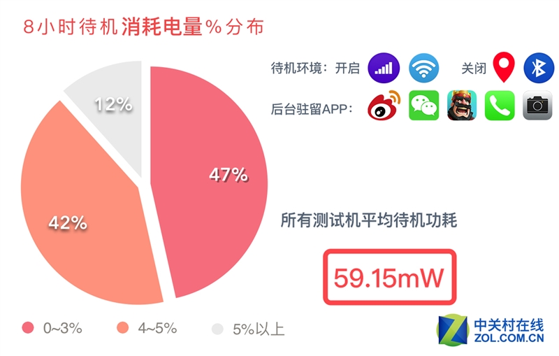 至于具体数字,我们也综合了43款机型的平均数,以各自“8小时待机功耗=8小时消耗百分比 x 电池容量(mAh) ÷ 8小时(h)x 电池电压(V)”的公式计算出了所有测试机的平均待机功耗,59.15mW意味着业界大多数厂商已经将待机功耗控制到了几个最多十几个mA的级别,粗略估算,纯待机几百小时不是梦。