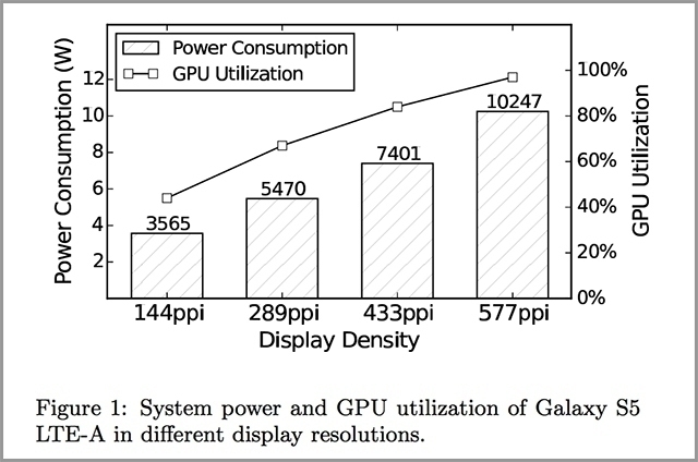 屏幕的高分辨率所带来的高耗电主要源于GPU对于多出来的数倍像素的计算量的增加和更多背光的需求;以2560x1440的原始分辨率(577ppi)运行时,高达10.247W的功耗比1280x720分辨率(289ppi)运行时的功耗高出87.3%。(数据来自《通过动态调整手机分辨率缩放的方式实现移动设备的功耗优化》,作者贺松涛、刘云新、周虎成,MobiCom2015)