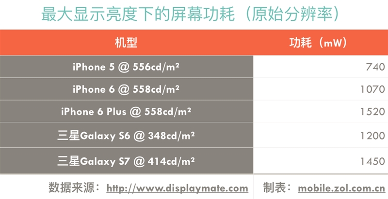 以iPhone 6 Plus、三星S7这样的最大亮度下屏幕功耗达1.5W左右的机型为例,一块10Wh的手机电池即使开机什么都不做、只以最高亮度持续打开屏幕放那儿7~8个小时也就没电了……