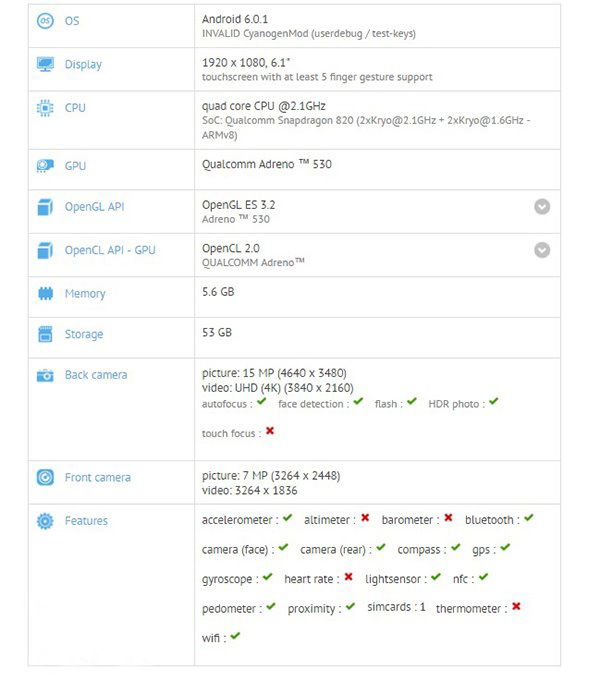 从跑分网站曝出的消息来看,该机采用6.1英寸的显示屏,除了屏幕不同之外,其他配置与一加手机3相同,包括骁龙820处理器、6GB运行内存,800万像素和1600万像素的摄像头组合,从屏幕的尺寸上看,如果该机发布,可能会命名为一加手机3 Max。