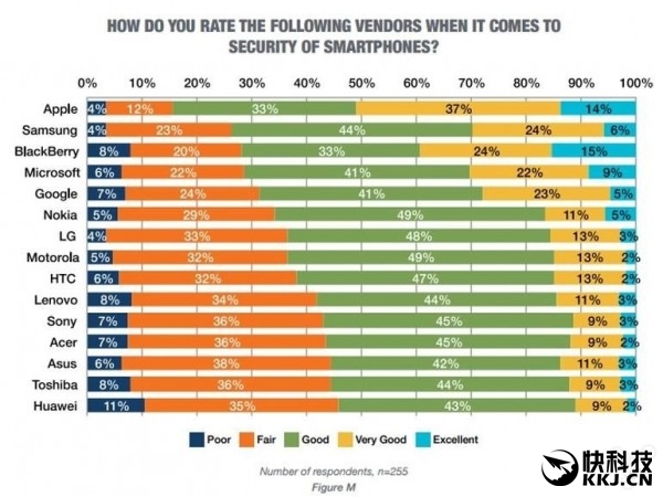 总的来说, 企业用户有12%认为苹果智能手机的安全性“还行”,33%的人给出的评价是“好”,37% 认为iPhone“非常安全”,而14%的人则是表示iPhone安全性“极其优秀”。当然,也有一部分人不看好iPhone的安全性,不过这个比例只有4%。就手机安全性而言,苹果的老对手三星紧随其后。