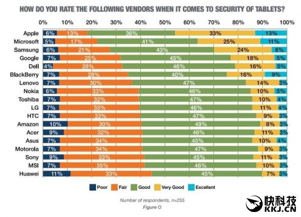 在企业领域里,苹果的移动设备一直都倍受青睐。虽然如今三星设备也越来越多地出现在企业领域,但是从安全角度来讲还是苹果更胜一筹。根据Tech Pro Research公布的一项最新数据,苹果是企业用户眼里最安全的手机品牌。在“非常好”和“极其优秀”这两个安全等级评选中,苹果都要领先于一切对手。