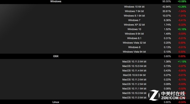 而且有意思的是,整个Windows系统中,只有Windows 10 的64位和32位是增长的,其他所有的系统都在下降,或是保持原状。其他系统方面,OSX与上个月持平,仍然是3.60%。至于Linux系统,在这个月下滑了0.04%达到了0.80%。