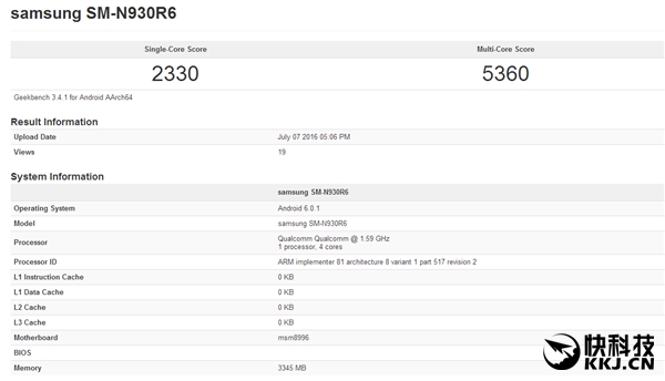 现在,编号“SM-N930R6”的另外一个版本的Note 7也出现了,处理器竟然还是骁龙820 MSM8996,单线程2330、多线程5360的成绩倒也符合骁龙820的水平,另外内存也还是4GB。