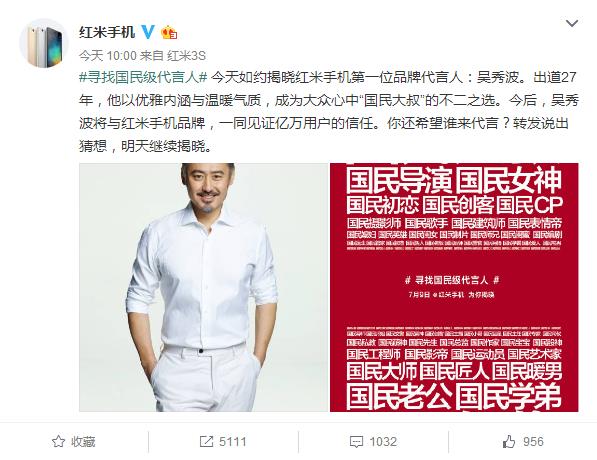 今天,红米手机官方微博宣布红米手机第一位品牌代言人是国民大叔吴秀波。接着在微博上表示:“吴秀波出道27年,他以优雅内涵与温暖气质,成为大众心中“国民大叔”的不二之选。今后,吴秀波将与红米手机品牌,一同见证亿万用户的信任。”