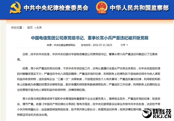 2015年12月27日,中央纪委监察部官方宣布,中国联合网络通信集团有限公司原党组书记、董事长,现中国电信集团公司党组书记、董事长常小兵涉嫌严重违纪,目前正接受组织调查。
