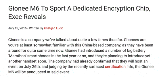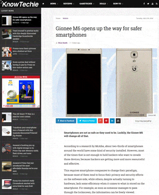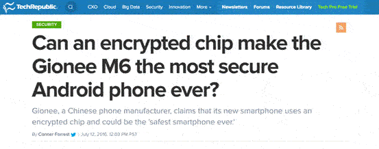 其中,TechRepublic报道标题为“加密芯片能否让金立M6成为最安全的安卓手机?”,并在文中直言道“金立的这款新机(金立M6)可能会是有史以来最安全的智能手机之一,且将会把消费级手机的安全性推向新高度。”