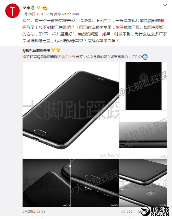 考虑到罗永浩此前曾在微博上讨论过圆形或者椭圆形Home键的问题,所以锤子T3真的采用圆形Home键的话并非不可能。