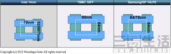 Intel、台积电和三星的“14nm”FinFET芯片内部结构尺寸对比(越小越好)