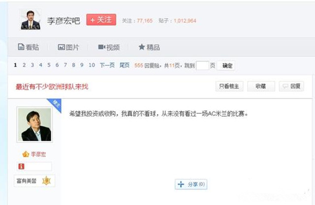 李彦宏贴吧回应收购AC米兰(图片来自新浪)