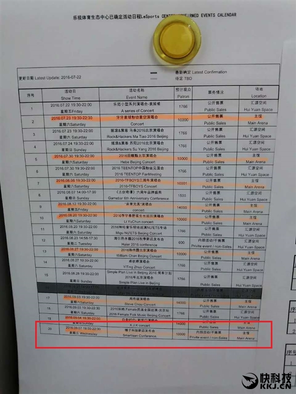 从网友向我们曝光的图片来看,9月7日锤子科技将在北京乐视体育生态中心(也就是五棵松体育馆)召开一场新品发布会,预计观众为1万人,票务情况为“内部活动/不售票”,使用的是乐视体育生态中心主馆。